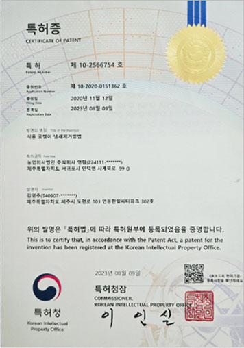 - 곤충 단백질인 굼벵이와 제주산 겨울비트를 활용하여 여타 인공감미료를 없이 9브릭스 이상의 당을 함유한 제품을 생산, 각종 박람회 및 회의 시 시음 행사를 실시 한 바 그 효능이 탁월하다는 의견처럼 굼벵이 숙취해소제가 알콜이나 아세트 알데하이드 분해능력이 타 제품에 월등하다는 제품 평가로 보아 숙취해소에 도움이 될 것이라는 가설을 세우고 이를 증명하는 실험과 함께 조성 및 제조 방법을 출원하고자 함